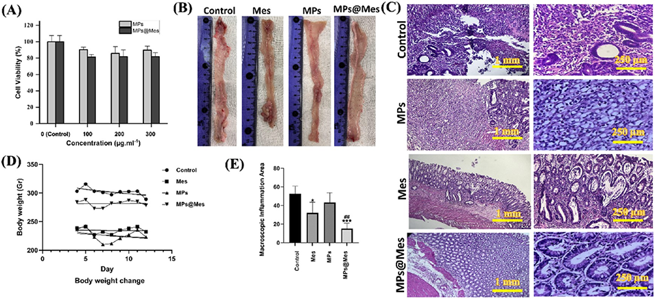 图6.(A)NIH/3T3细胞系的细胞存活率(%);(B)所有实验组的结肠样本,展示炎症程度及溃疡性结肠炎的宏观特征;(C)实验周期结束后,对照组、空白微球组、单纯美沙拉嗪组、Alg-CA-κCar/CS@Mes微球组结肠样本的染色图像(从左至右,放大倍数分别为100倍和400倍);(D)所有组在12天实验周期内的体重变化;(E)使用ImageJ软件对各组宏观炎症面积的分析结果。***P<0.001表示与对照组相比差异显著;*P<0.05表示与对照组相比差异显著;####P<0.001表示与空白微球组相比差异显著。