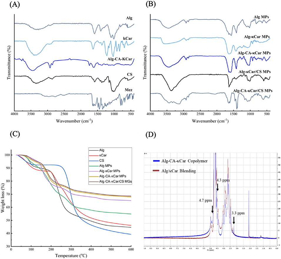 图3.(A)纯材料的傅里叶变换红外光谱(FTIR);(B)不同微球复合物的傅里叶变换红外光谱(FTIR);(C)纯材料与微球的热重分析(TGA)曲线;(D)海藻酸盐/κ-卡拉胶(Alg/κCar)混合物与Alg-CA-κCar共聚物的氢核磁共振(¹H NMR)光谱。