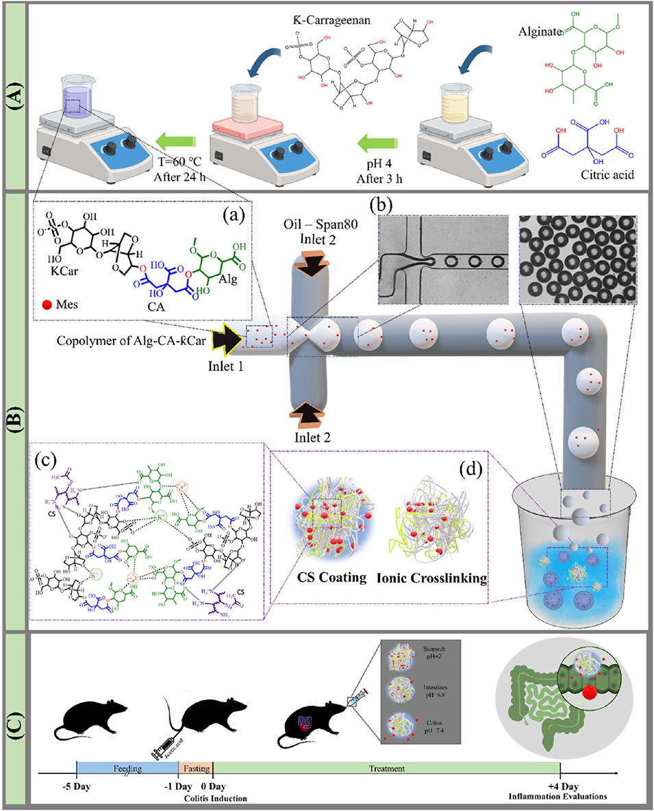 图2. 用于生成油包水乳液液滴及制备微球的微流控系统示意图。(A)海藻酸盐-柠檬酸-κ-卡拉胶(Alg-CA-κCar)共聚物的合成过程;(B)微流控系统中的液滴生成:(a)Alg-CA-κCar共聚物的化学结构;(b)该过程的光学显微镜图像;(c)离子交联并包覆壳聚糖(CS)后的Alg-CA-κCar化学结构;(d)在离子与CS溶液中,Alg-CA-κCar/CS@Mes微球的包覆及离子交联过程;(C)Alg-CA-κCar/CS@Mes微球对炎症性肠病(IBD)模型大鼠的体内抗炎效果评估。