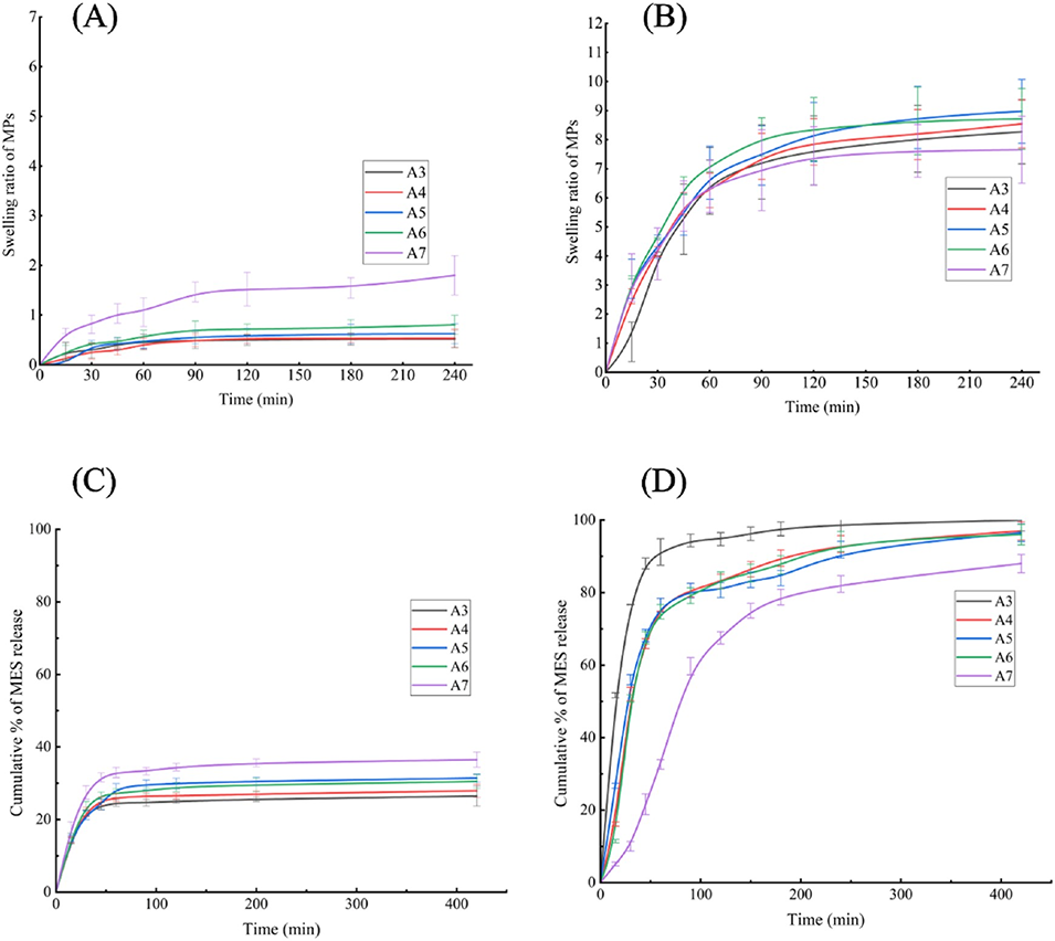 图5. 微球在(A)酸性条件、(B)生理条件下的溶胀率;美沙拉嗪在(C)酸性条件、(D)生理条件下从微球中的释放曲线。