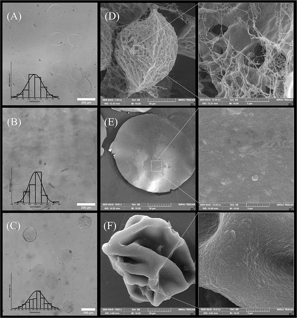 图4.(A)海藻酸盐微球(Alg MPs)、(B)Alg-CA-κCar微球、(C)Alg-CA-κCar/CS微球的光学显微镜图像及粒径分布图;(D)Alg MPs、(E)Alg-CA-κCar微球、(F)Alg-CA-κCar/CS微球的场发射扫描电子显微镜(FE-SEM)图像。