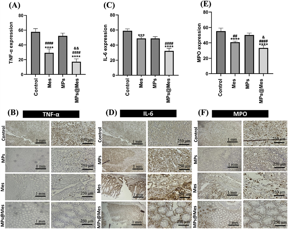 图7.(A)使用ImageJ软件分析所有实验组肿瘤坏死因子-α(TNF-α)的表达水平;(B)实验周期结束后各组结肠样本的染色图像,展示对照组、空白微球组、单纯美沙拉嗪组、Alg-CA-κCar/CS@Mes微球组中TNF-α的表达水平;(C)使用ImageJ软件分析所有实验组白细胞介素-6(IL-6)的表达水平;(D)实验周期结束后各组结肠样本的染色图像,展示对照组、空白微球组、单纯美沙拉嗪组、Alg-CA-κCar/CS@Mes微球组中IL-6的表达水平;(E)使用ImageJ软件分析所有实验组髓过氧化物酶(MPO)的表达水平;(F)实验周期结束后各组结肠样本的染色图像,展示对照组、空白微球组、单纯美沙拉嗪组、Alg-CA-κCar/CS@Mes微球组中MPO的表达水平(从左至右,放大倍数分别为100倍和400倍)。****P<0.0001表示与对照组相比差异显著;####P<0.0001表示与空白微球组相比差异显著;&&P<0.01表示与单纯美沙拉嗪组相比差异显著。