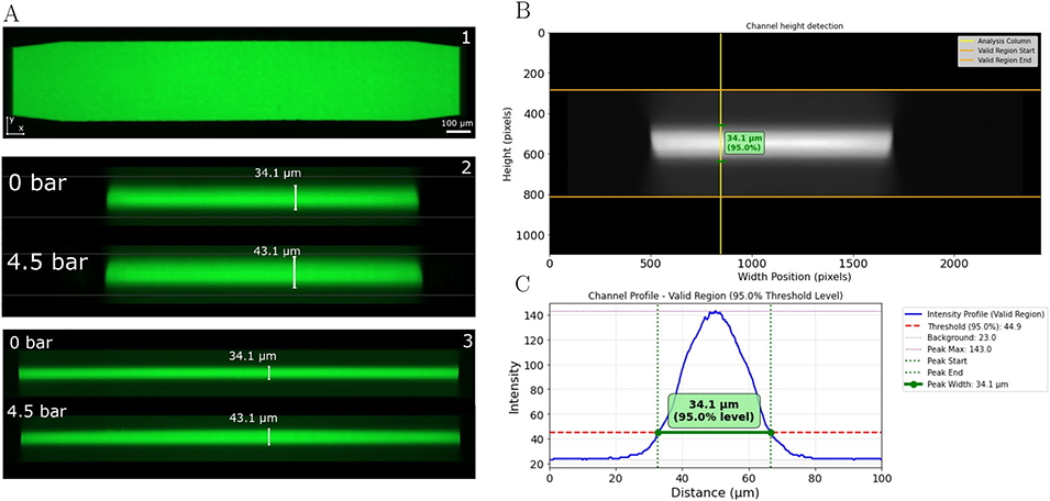 图2. 为施加0bar和4.5bar压力下微流控通道横截面变化的z堆叠共聚焦图像。通道内填充5μM荧光素钠溶液,采用477nm波长激光激发。A1为扩展通道段的俯视图。A2为沿A1的y轴获取的横截面图。A3为沿A1上标注的x轴获取的横截面图。连续相和分散相均为荧光素钠溶液,流速为500μL/h。图像通过NIS Viewer软件拍摄。B为0bar超压作用下通道高度计算的Python程序(分析结果图)。C为检测到的最大通道高度沿垂直轴的强度分布图。