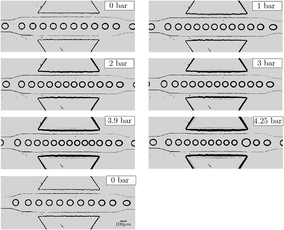 图3. 为通过施加从0bar到4.25bar再恢复至0bar的超压序列,诱导主通道变形,从而实现液滴流动行为控制的示意图(或实验结果图)。连续相为含2wt%ABIL EM 90表面活性剂的矿物油,流速为450μL/h;分散相为水,流速为70μL/h。