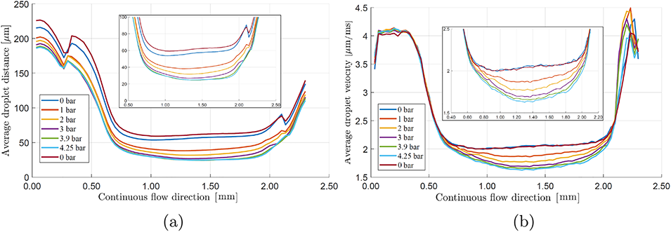 图4. a为不同压力下,液滴平均速度随其在扩展通道段内沿流动方向位置变化的关系图。液滴在约300μm处进入扩展通道,在2200μm处离开。插图显示y轴范围为1.5-2.5μm/s的液滴平均速度图。b为压力室施加不同压力时,液滴平均最近邻距离随其在扩展通道段内沿流动方向位置变化的关系图。“0”位置对应图1C中x=0的标注处。插图显示y轴范围为0-100μm的液滴平均距离图。(实验条件:连续相为含2wt%ABIL EM 90表面活性剂的矿物油,流速为450μL/h;分散相为水,流速为70μL/h。)