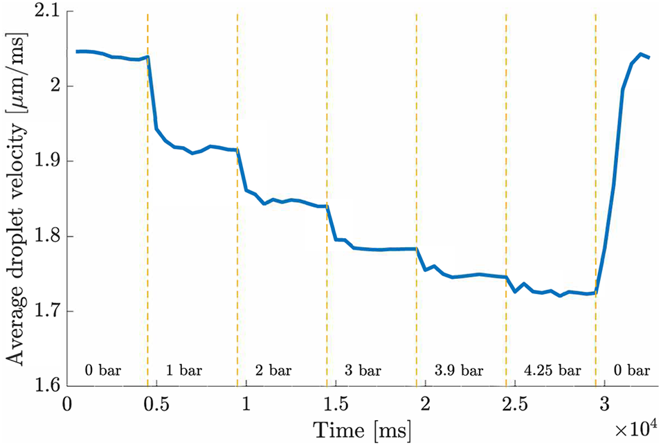 图5. 为在施加压力逐渐增加的一系列条件下,液滴在压缩通道段内的平均速度随时间变化的关系图。“0”位置对应图1C中x=0的标注处。(实验条件:连续相为含2wt%ABIL EM 90表面活性剂的矿物油,流速为450μL/h;分散相为水,流速为70μL/h。)