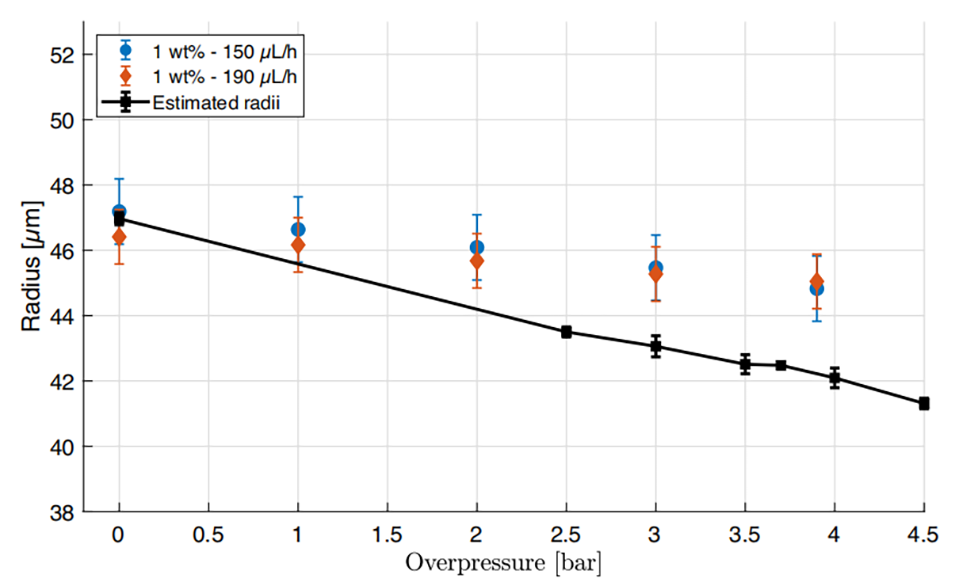 图6. 为不同施加压力下,液滴半径相对于初始半径的减小量关系图。其中,Rmax表示初始液滴半径,Rdiff表示初始液滴半径与每个液滴观察到的最小半径之间的差值。每个数据点的液滴平均半径均基于至少643个液滴的统计结果计算得出。(实验条件:连续相为含1wt%ABIL EM 90表面活性剂的矿物油,流速为450μL/h;分散相为水,流速分别为150μL/h和190μL/h。)