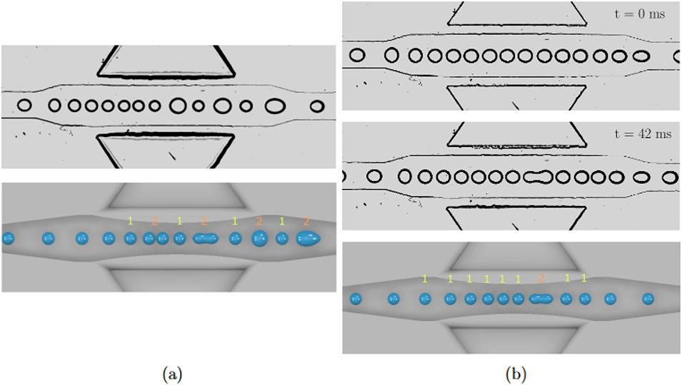图8. a为液滴聚结被控制为“2个聚结液滴+1个非聚结液滴”的2:1交替模式的实验结果图。压力室施加的超压为3.5bar。b为压力室内部施加3.5bar超压时的单个液滴对聚结事件的实验结果图。上图显示压力室开始施加超压前一刻的帧图像;中图显示42ms后发生的单个液滴对聚结事件。(两组实验的共同条件:连续相为含2wt%ABIL EM 90表面活性剂的矿物油,流速为1000μL/h;分散相为水,流速为150μL/h。)