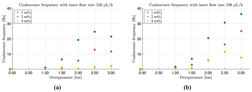 图7. 为不同施加压力下的聚结频率关系图。所有数据点的样本量在643-933个之间。连续相为含3种不同重量百分比ABIL EM 90表面活性剂的矿物油,流速为1000μL/h;分散相为水,图a中流速为150μL/h,图b中流速为190μL/h。每个数据点分析的液滴数量最少为643个。
