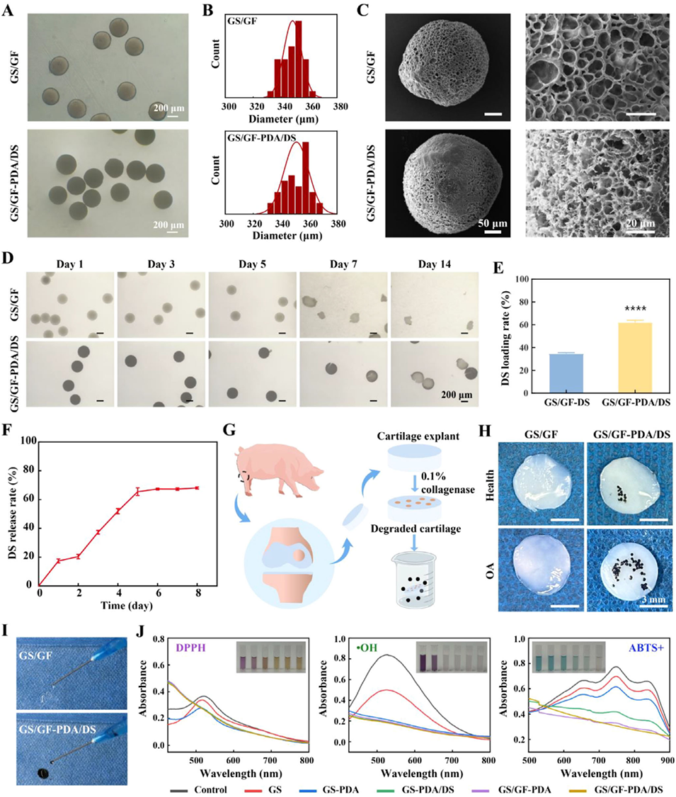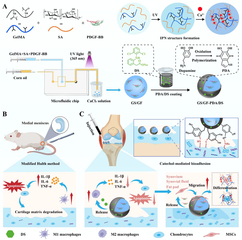1、本研究开发了一种用于骨关节炎(OA)治疗的可注射水凝胶微球(GS/GF-PDA/DS)。该微球采用微流控技术制备,具有互穿聚合物网络结构,并通过聚多巴胺涂层实现软骨缺损处的原位锚定。