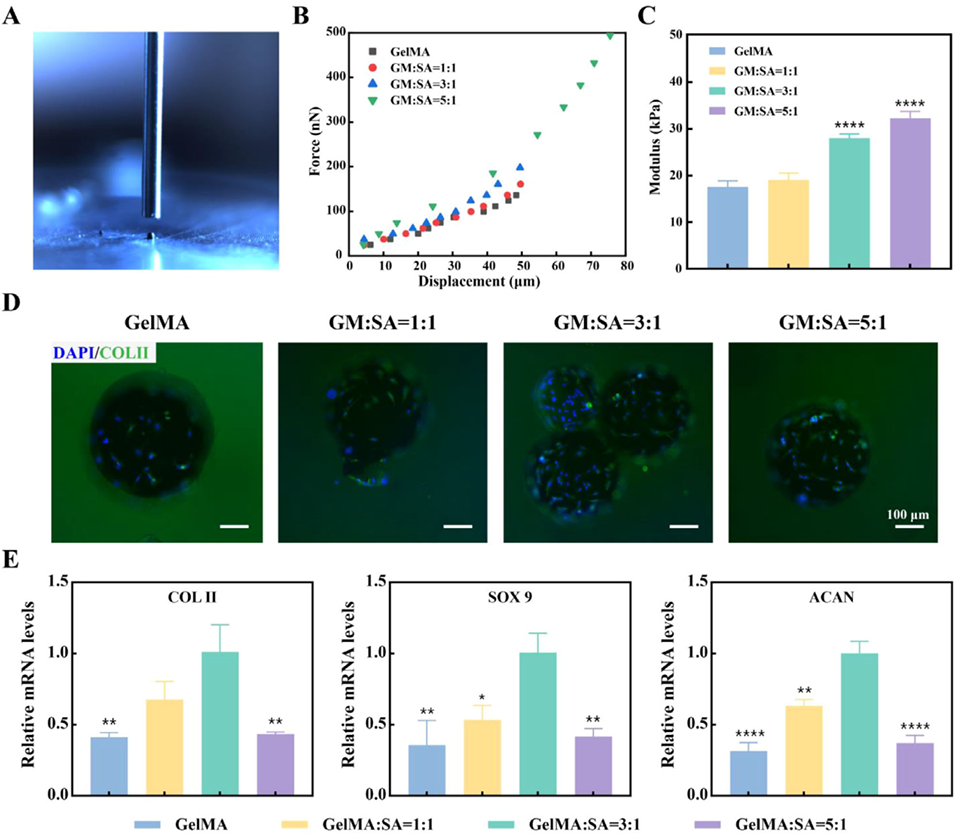 图1. 力学性能与软骨分化性能。(A)水凝胶微球力学性能测试照片;(B)力-位移曲线;(C)不同材料比例水凝胶微球的模量定量结果;(D)骨髓间充质干细胞(BMSCs)的Ⅱ型胶原(COLⅡ)免疫荧光染色图;(E)骨髓间充质干细胞软骨分化相关基因表达的实时荧光定量聚合酶链反应(RT-qPCR)结果。数据以平均值±标准偏差表示,采用单因素方差分析进行显著性检验;样本量n=3;*p<0.05,**p<0.01,****p<0.0001。