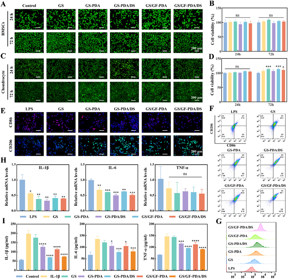 图4. 细胞相容性与炎症调控效果。(A)骨髓间充质干细胞的活/死染色图像;(B)骨髓间充质干细胞的CCK-8定量结果;(C)软骨细胞的活/死染色图像;(D)软骨细胞的CCK-8定量结果;(E)巨噬细胞极化的免疫荧光染色图;(F)巨噬细胞极化的流式细胞术结果;(G)CD206流式细胞术峰图;(H)巨噬细胞中炎症因子基因表达的实时荧光定量聚合酶链反应(RT-qPCR)结果;(I)白细胞介素-1β(IL-1β)、白细胞介素-6(IL-6)和肿瘤坏死因子-α(TNF-α)的酶联免疫吸附测定(ELISA)定量结果。数据以平均值±标准偏差表示,采用单因素方差分析进行显著性检验;样本量n=3;*p<0.05,**p<0.01,***p<0.001,****p<0.0001,ns表示无显著性差异。