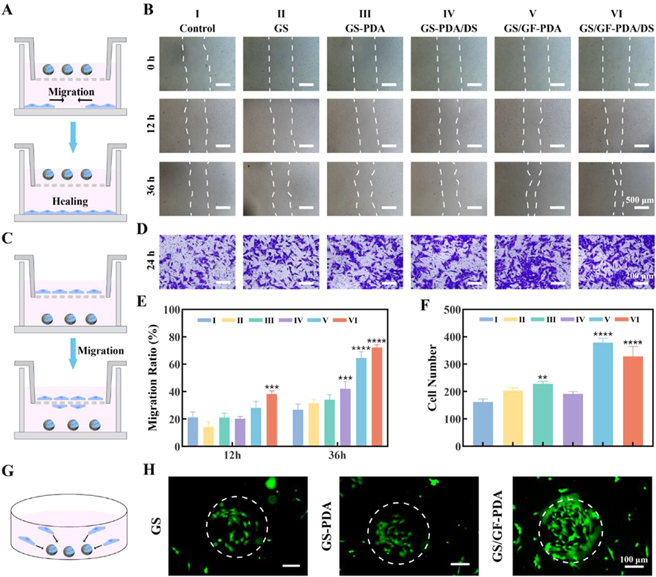 图3. 水凝胶微球的干细胞募集能力。(A)划痕愈合实验示意图;(B)骨髓间充质干细胞在0、12、36小时的划痕愈合实验代表性显微镜图像;(C)细胞趋化实验示意图;(D)骨髓间充质干细胞趋化实验的结晶紫染色代表性图像;(E)划痕愈合率;(F)迁移细胞数量定量结果;(G)微球与骨髓间充质干细胞共培养示意图;(H)微球与骨髓间充质干细胞共培养的活/死染色图像。数据以平均值±标准偏差表示,采用单因素方差分析进行显著性检验;样本量n=3;**p<0.01,***p<0.001,****p<0.0001。