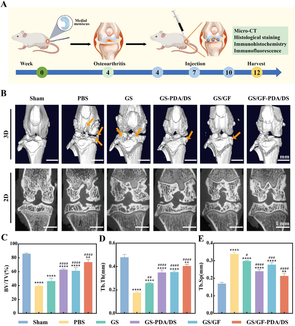 图5. 体内治疗效果。(A)动物建模与实验流程示意图;(B)显微计算机断层扫描的三维和二维图像(箭头指示骨赘);(C)骨体积分数(BV/TV)、(D)骨小梁厚度(Tb.Th)、(E)骨小梁分离度(Tb.Sp)的定量结果。数据以平均值±标准偏差表示,采用单因素方差分析进行显著性检验;样本量n=4;*表示与假手术(Sham)组比较,#表示与磷酸盐缓冲液(PBS)组比较;*p<0.05,**p<0.01,***p<0.001,****p<0.0001。