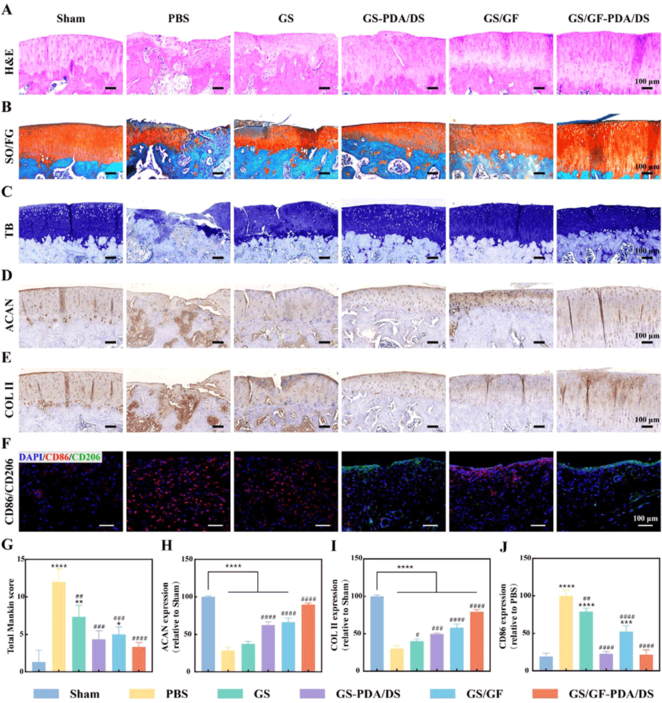 图6. 组织学染色分析。(A)治疗8周后关节软骨的苏木精-伊红(H&E)染色图;(B)番红O-固绿染色图;(C)甲苯胺蓝染色图;(D)治疗8周后关节软骨的蛋白聚糖免疫组织化学染色图;(E)Ⅱ型胶原免疫组织化学染色图;(F)治疗8周后滑膜组织的CD86/CD206免疫荧光染色图;(G)曼金(Mankin)总评分;(H)蛋白聚糖、(I)Ⅱ型胶原、(J)CD86的定量结果。数据以平均值±标准偏差表示,采用单因素方差分析进行显著性检验;样本量n=4;*表示与假手术(Sham)组比较,#表示与磷酸盐缓冲液(PBS)组比较;*p<0.05,**p<0.01,***p<0.001,****p<0.0001。