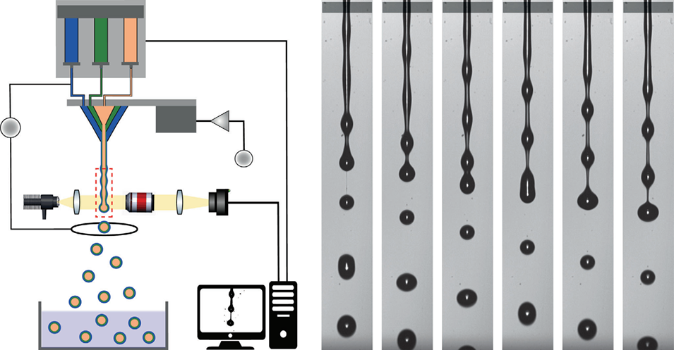 近期,有研究人员开发了一种电-机械协同驱动的微流控平台,通过精确调控压电激励频率以选择射流破碎模式,并结合直流电场抑制“珠串”结构的液滴聚并,从而在宽范围内(半径~170–260 µm)制备出高单分散性的复合液滴。该液滴经凝胶化后,可形成尺寸均一、结构完整的核壳水凝胶胶囊,成功实现了细胞的高活性封装与3D培养。相关研究以“Extending the Range of Sizes of Monodisperse Core-Shell Hydrogel Capsules from Composite Jet Breakup by Combined Electrical and Mechanical Actuation”为题目,发表在期刊《Advanced Science》上。