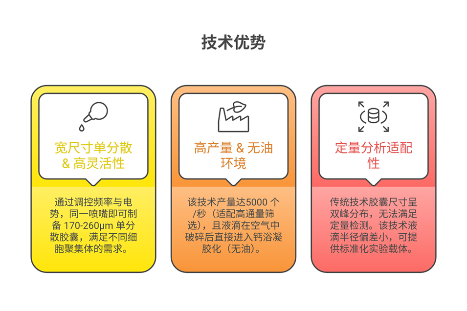 虽现有技术如电喷雾、气动雾化、单纯机械致动等试图改进,但电喷雾液滴通常小于10μm且需中和电荷,气动雾化尺寸分布较宽,单纯机械致动仅能在窄频率范围内实现单分散,均无法全面解决上述问题。同时,生物工程中常用的水凝胶胶囊制备还面临油相环境可能影响细胞存活、多细胞聚集体制备重现性差等挑战,因此亟需更优的制备策略。