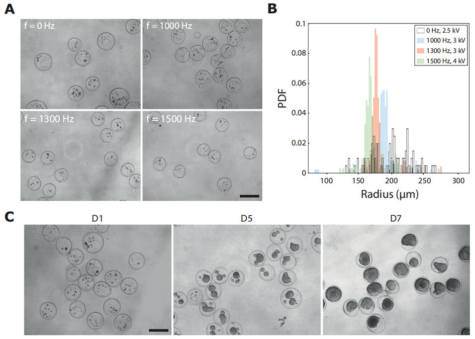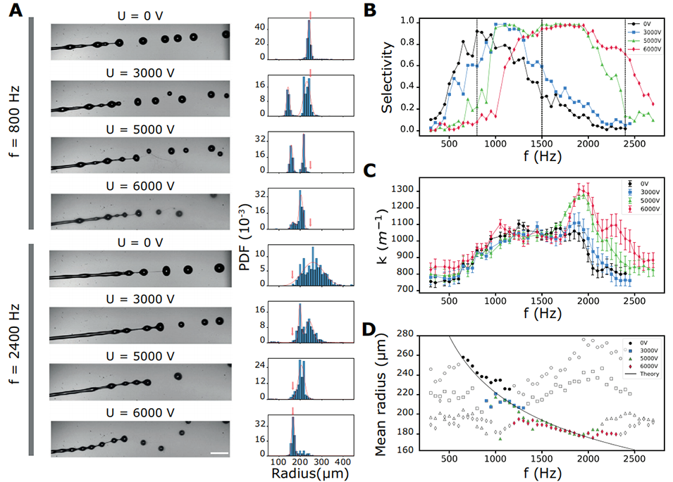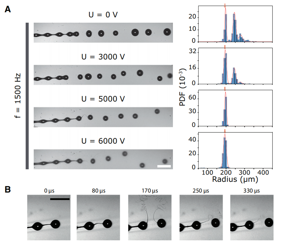 3、研究发现电场可抑制黏弹性细丝、减少聚并,从而显著提高液滴单分散性。使用内径95 μm的喷嘴,在800–2500 Hz频率与0–6 kV电压协同调控下,成功制备出半径约170–260 μm的单分散液滴。