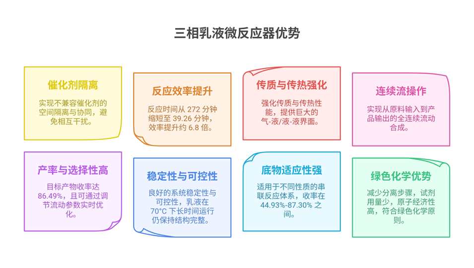 1、本研究采用液滴微流控技术,开发了一种水包油包水(W/O/W)三相乳滴微反应器,以实现高效连续的串联反应。
