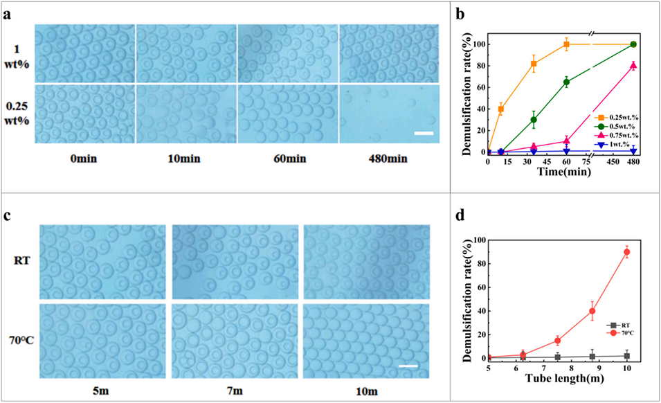 图2. 三相乳液稳定性研究。(a)RSN-749 树脂浓度对三相乳液稳定性的影响;(b)不同 RSN-749 树脂浓度下,三相乳液在不同时间的破乳率;(c)温度对三相乳液稳定性的影响;(d)不同管路长度和温度下,三相乳液的破乳率。所有比例尺均为 500 μm,每组实验重复 3 次。