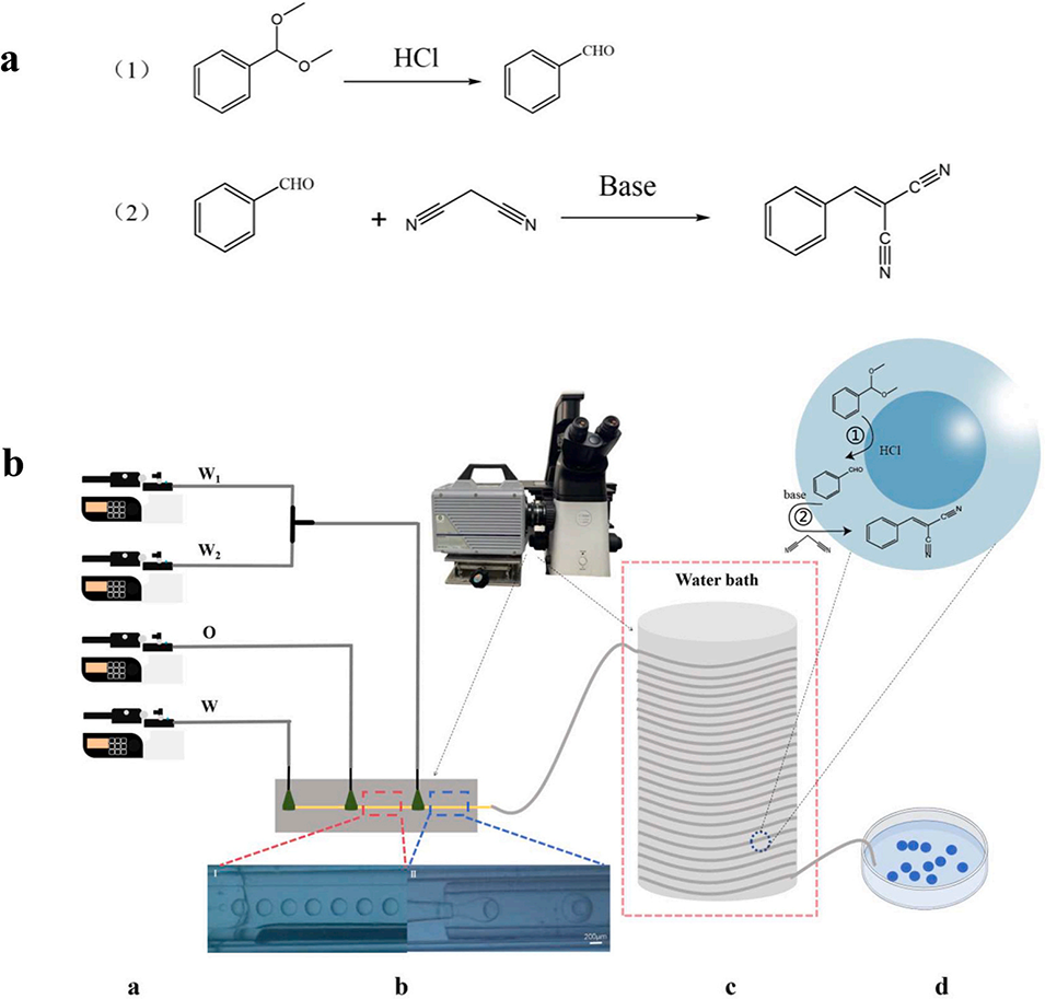 图1.(a)脱缩醛 - Knoevenagel串联反应示意图:苯甲醛二甲基缩醛(底物)→苯甲醛(中间产物)→亚苄基丙二腈(目标产物),反应分别由内水相中的盐酸(HCl)和外水相中的 4 - 二甲氨基吡啶(DMAP)催化;(b)微流控反应平台示意图,包括注射泵(用于流体输送)、同轴环形微芯片(用于乳液生成)、油浴(用于温度控制)和聚四氟乙烯(PTFE)管道(反应管路,规格 1.0×1.4 mm)。(b)的比例尺为 200 μm。