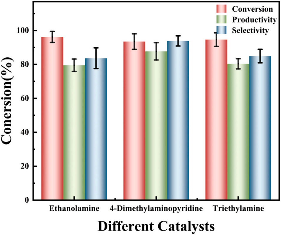 图4. 不同催化剂对反应性能(转化率、选择性、产率)的影响;每组实验重复 3 次。