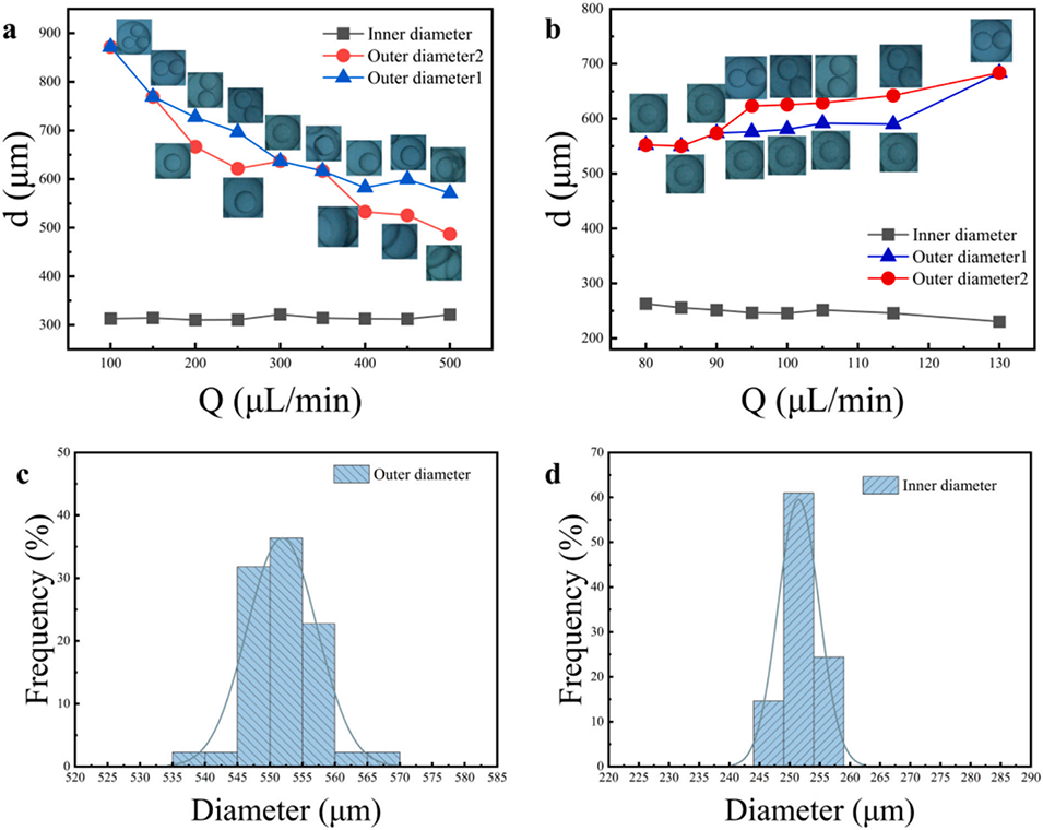 图3.(a)(b)三相乳液中液滴流速与液滴尺寸的关系:(a)仅改变外水相流速;(b)仅改变中间油相流速;(c)(d)三相乳液单分散性研究:(c)外水相液滴尺寸;(d)内水相液滴尺寸。