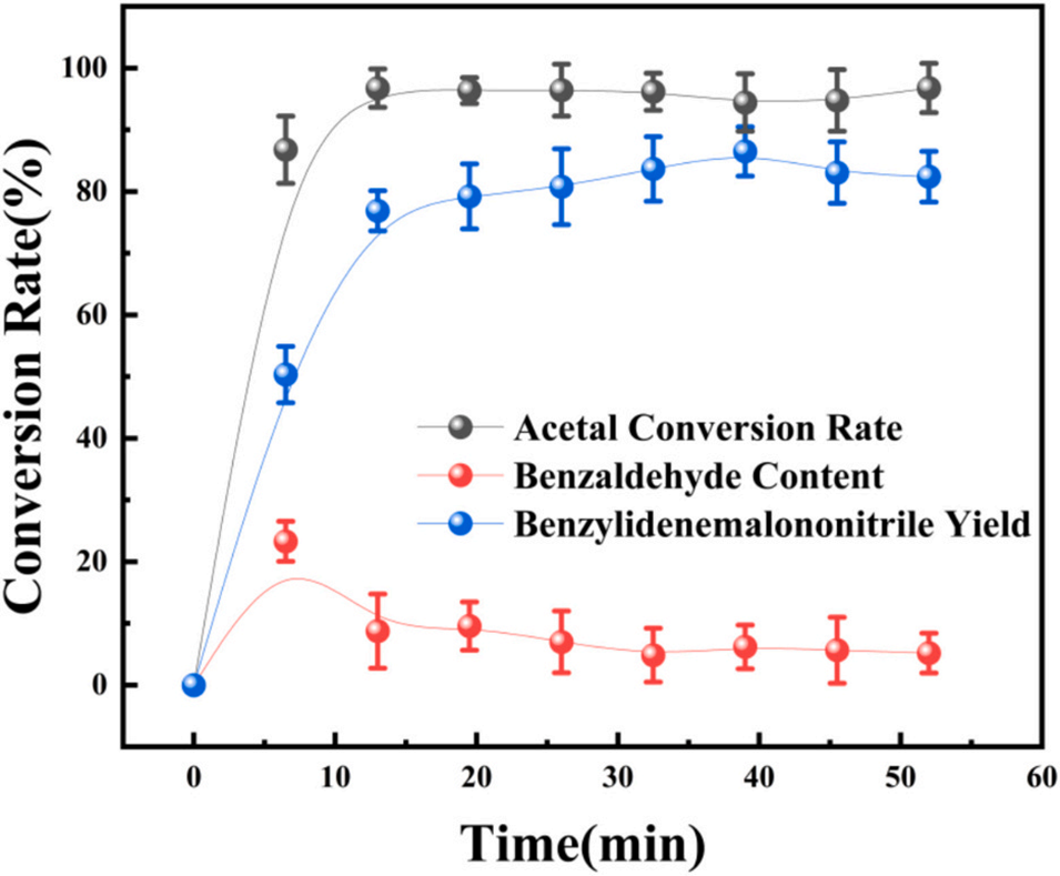 3、该系统成功应用于脱缩醛-Knoevenagel串联反应,与传统间歇式两步合成相比,反应时间从272分钟缩短至39.26分钟,效率提高6.8倍,产率达86.49%。
