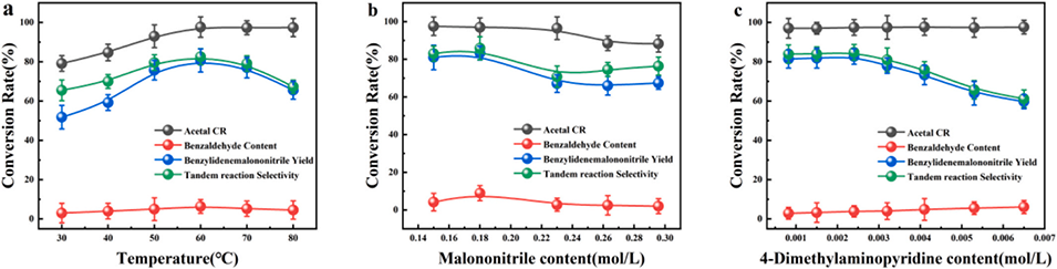 图5. 串联反应整体优化结果:(a)温度优化;(b)反应物丙二腈浓度优化;(c)催化剂浓度优化。每组实验重复 3 次。