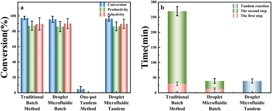 图8. 脱缩醛 - Knoevenagel反应不同反应方式的实验结果对比:(a)不同反应方式的转化率和产率对比;传统批次两步合成条件为:60℃、500 rpm 磁力搅拌,先加入 0.5 mol/L 盐酸反应 2 h,中间产物分离后(耗时 2 h)再加入 0.0024 mol/L DMAP,总反应时间 272 min;(b)不同反应方式的反应时间对比。每组实验重复 3 次。