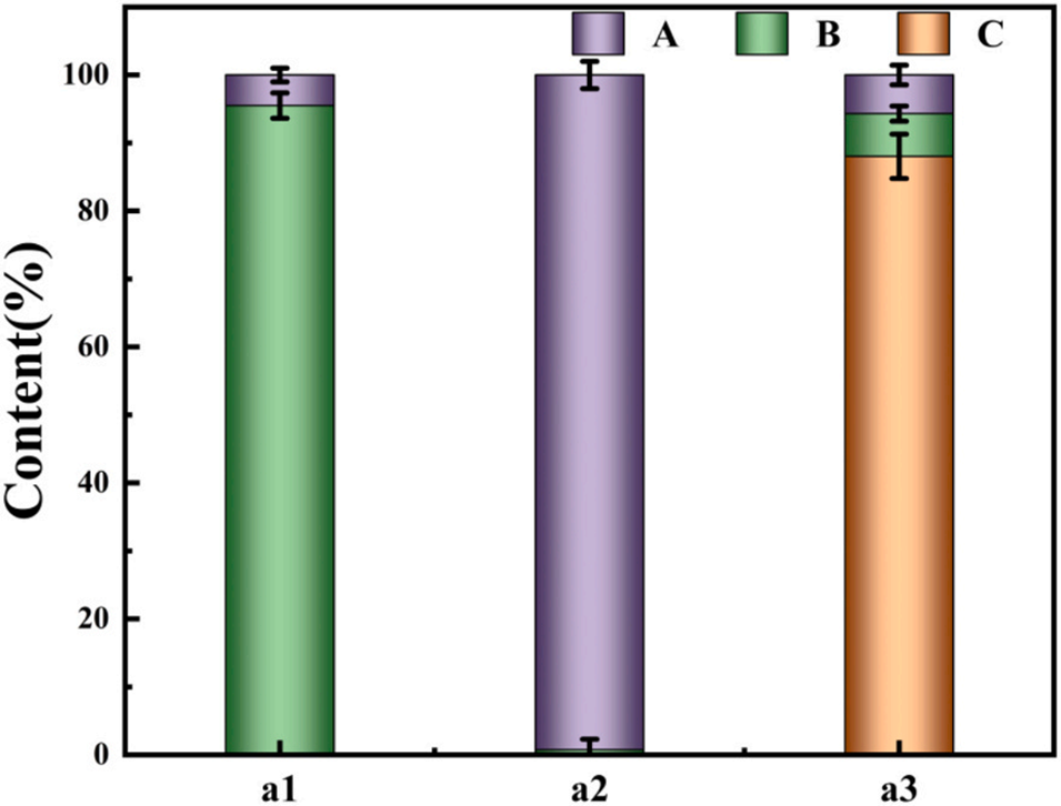 图7. 三相乳液中催化剂空间分布的对比实验结果,其中 A 代表苯甲醛二甲基缩醛,B 代表苯甲醛,C 代表亚苄基丙二腈。每组实验重复 3 次。