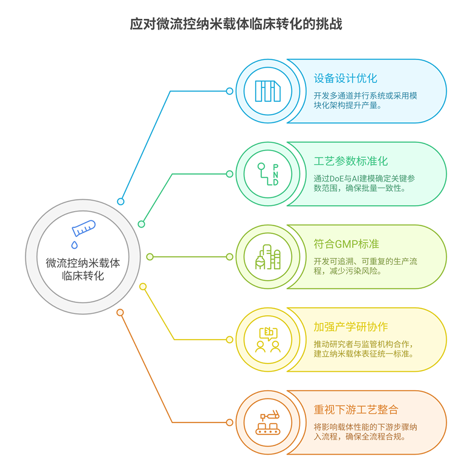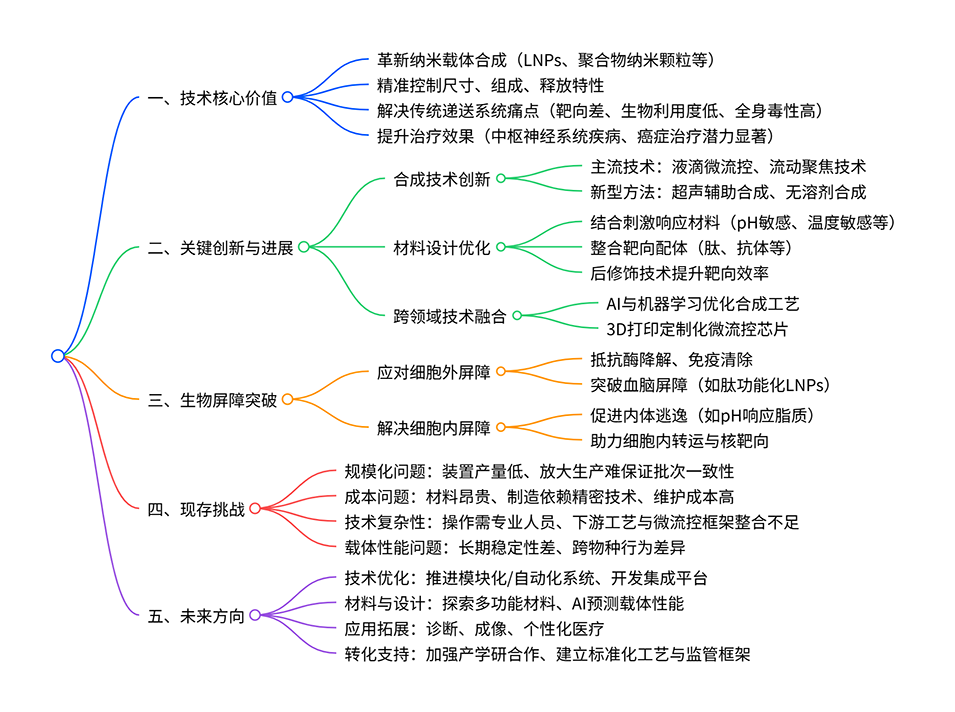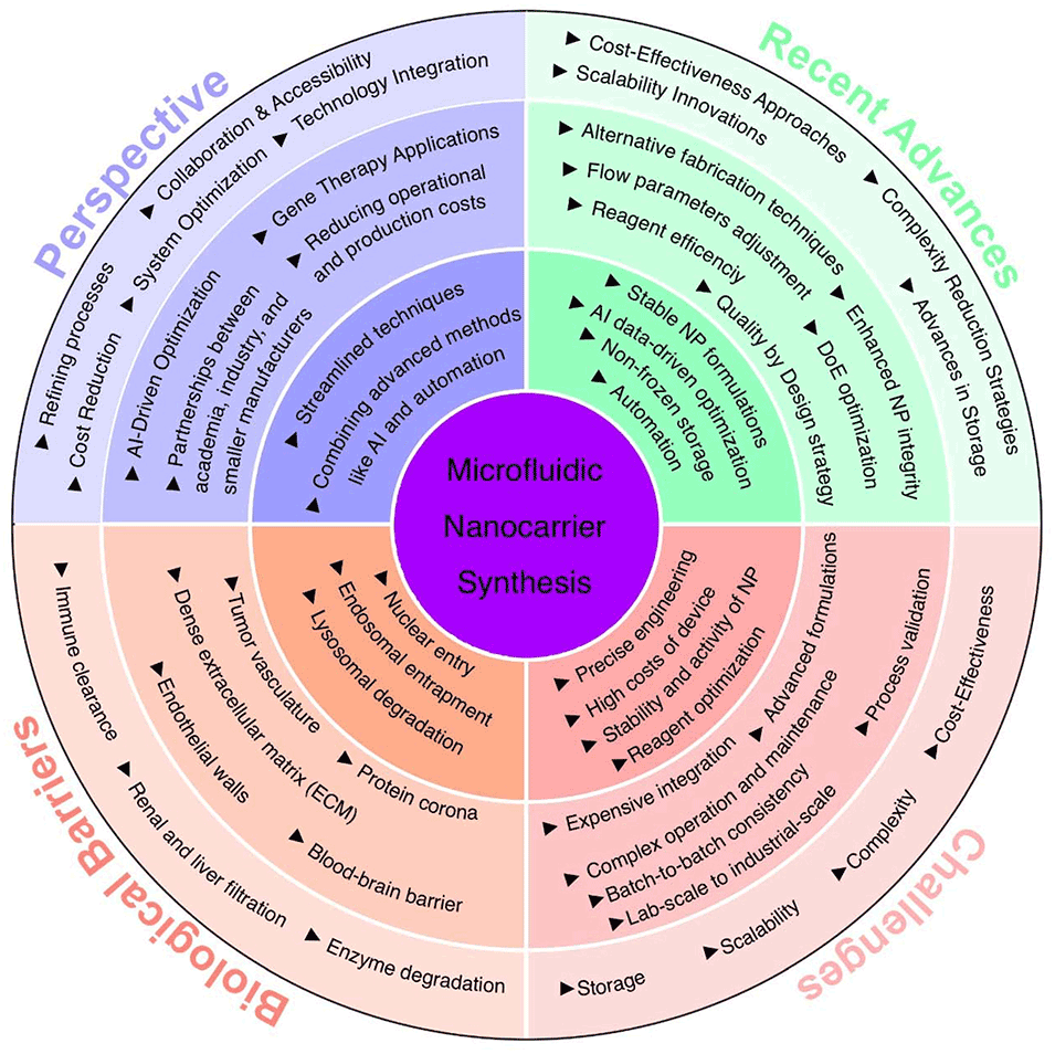 图7:微流控纳米载体合成的挑战与机遇模型图。以合成过程为核心,围绕四大维度:挑战(规模化、成本、复杂性、储存);最新进展(QbD 策略、流量控制、稳定配方、非冷冻储存);生物屏障(免疫清除、血脑屏障等);未来方向(系统优化、成本降低、技术整合、产学研合作),全面呈现该领域核心框架。