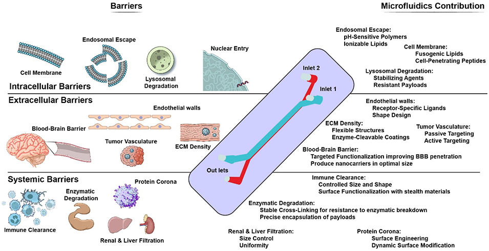图1:微流控技术助力纳米载体跨越生物屏障的机制图。展示纳米载体在全身、细胞外、细胞内层面面临的关键生物屏障(如免疫清除、血脑屏障、溶酶体降解),对应微流控技术的解决方案(如控制尺寸形状、靶向功能化、精准包裹药物),体现微流控如何针对性突破屏障以提升纳米载体效能。