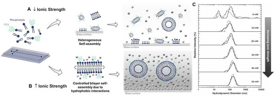 图5:离子强度对微流控合成隐形阳离子脂质体(SCLs)的影响图。A、B 分别为低、高离子强度环境下 SCLs 形成示意图,高离子强度通过增强疏水作用促进脂质双层有序自组装;C 为不同 PBS 浓度(0-50 mM)下 SCLs 的粒径分布曲线,验证离子强度对颗粒均一性的调控作用。