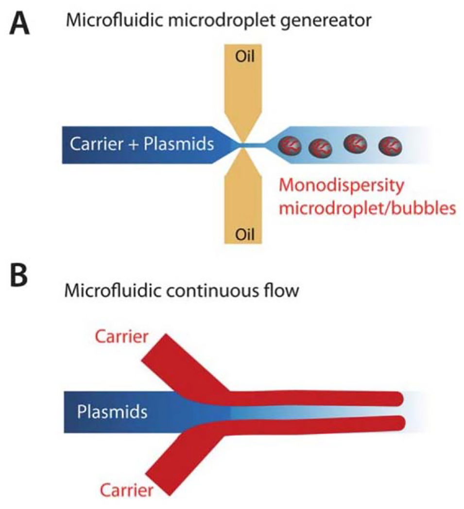图2:纳米载体的微流控合成方法示意图。A 为微流控微滴发生器:将载体与遗传物质溶液包裹在不相溶油相中,形成单分散微滴/气泡,实现纳米载体精准合成;B 为微流控连续流系统:载体与质粒分别进入不同通道,可控混合以高效、可重复合成纳米载体。
