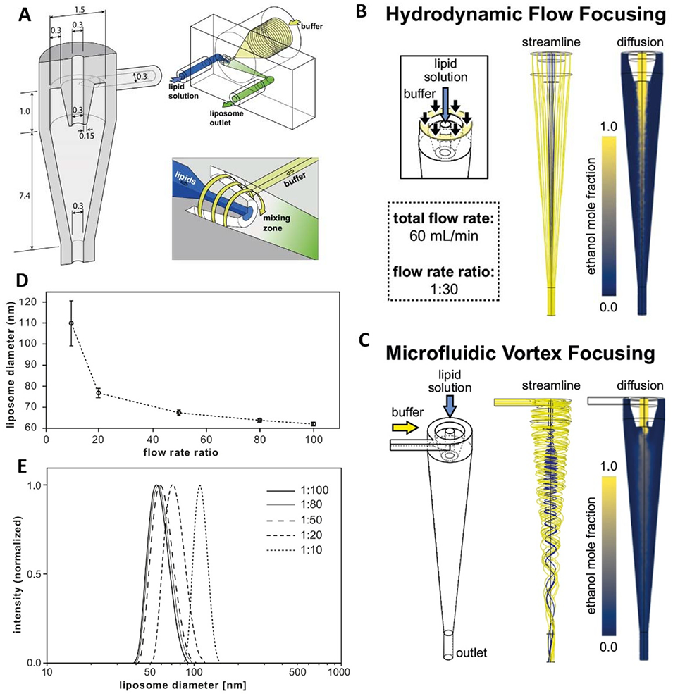图3:微流控涡旋聚焦(MVF)装置设计与制造图。A 为装置流体结构示意图(含环形交汇点、锥形混合区)及尺寸标注;B 为水与乙醇共流的模拟图(流线、浓度分布);C 为不同距离处的径向溶剂浓度曲线;D、E 分别为脂质体平均直径与归一化尺寸分布,验证该装置可在 60 mL/min 总流量下调控脂质体尺寸(27-100 nm)且保持均一性。