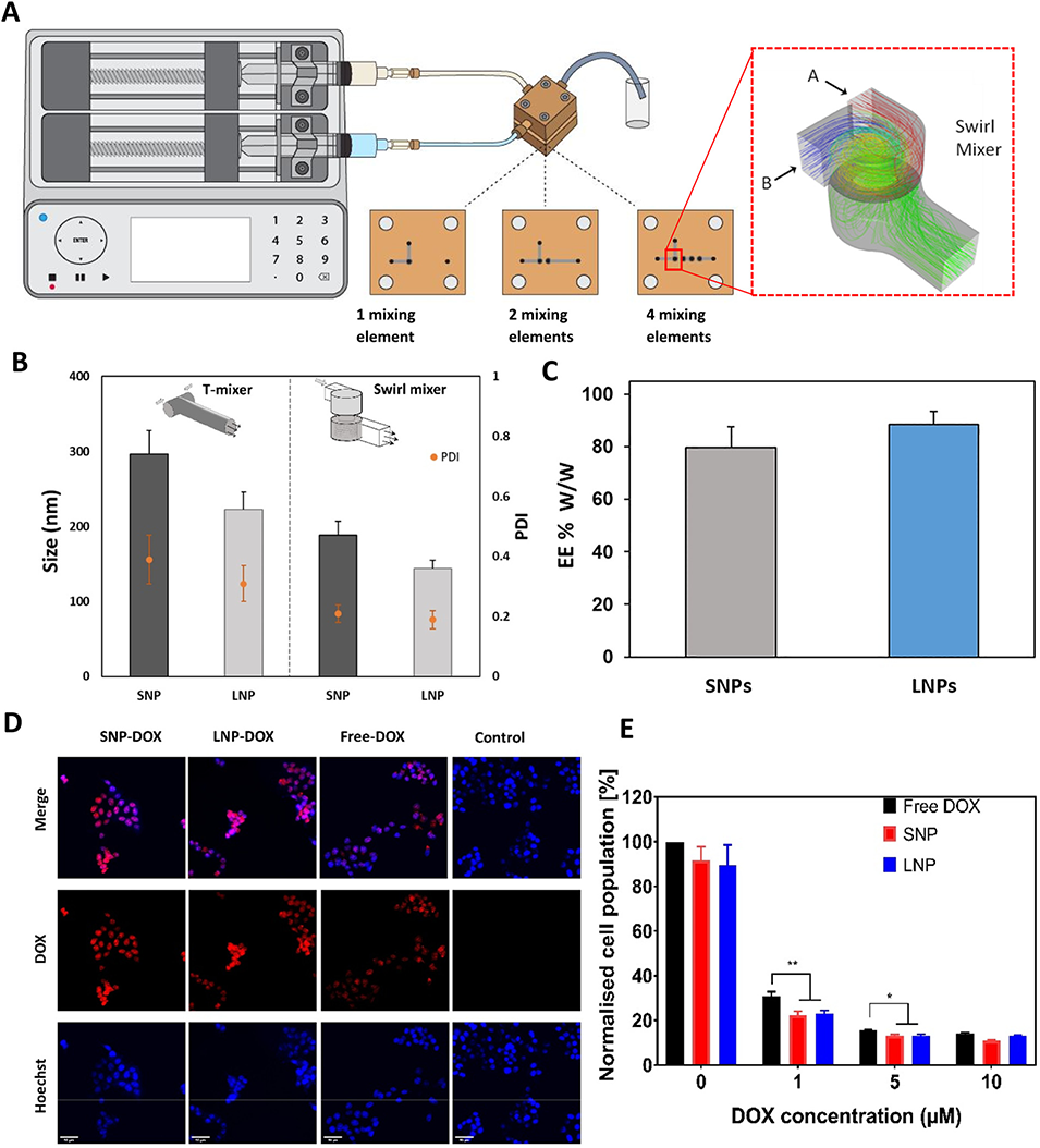 图4:微流控旋流混合器设计与性能图。A 为旋流混合器结构(含 1/2/4 个可调混合元件),通过产生旋流实现快速均匀混合;B 对比 T 型混合器与旋流混合器生成的 SNPs、LNPs,显示后者颗粒更小、PDI 更低;C 为旋流混合器制备的 SNPs、LNPs 对阿霉素的包封效率;D 为三种药物(游离 DOX、SNP-DOX、LNP-DOX)在 HCT 116 细胞中的摄取荧光图;E 为三种药物处理后的细胞存活情况,体现载体的优势。