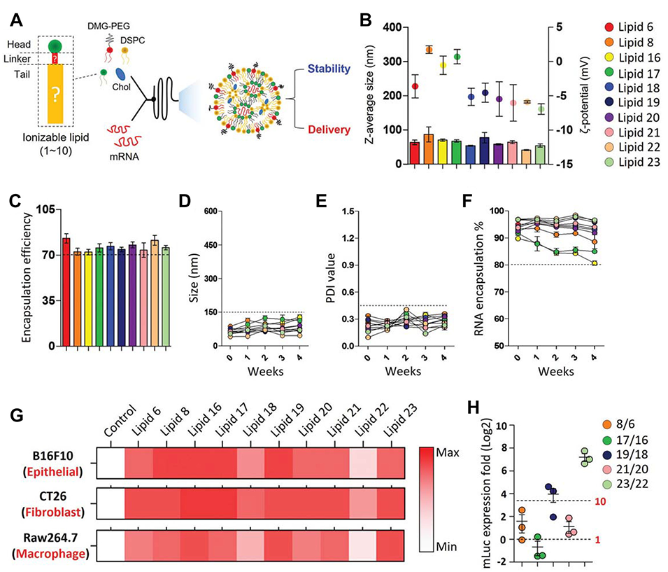 图6:细胞特异性脂质纳米颗粒(LNPs)设计与性能图。A 为 LNP 结构示意图(含可电离脂质、胆固醇、DSPC、PEG),强调脂质尾部对稳定性和递送效率的影响;B 为不同脂质 LNP 的粒径与 zeta 电位随时间变化;C-E 分别为 mRNA 包封效率、粒径稳定性、PDI 稳定性数据;G、H 通过荧光实验与定量分析,展示不同脂质 LNP 对 B16F10(上皮)、CT26(成纤维)、Raw264.7(巨噬细胞)的细胞特异性递送效率。