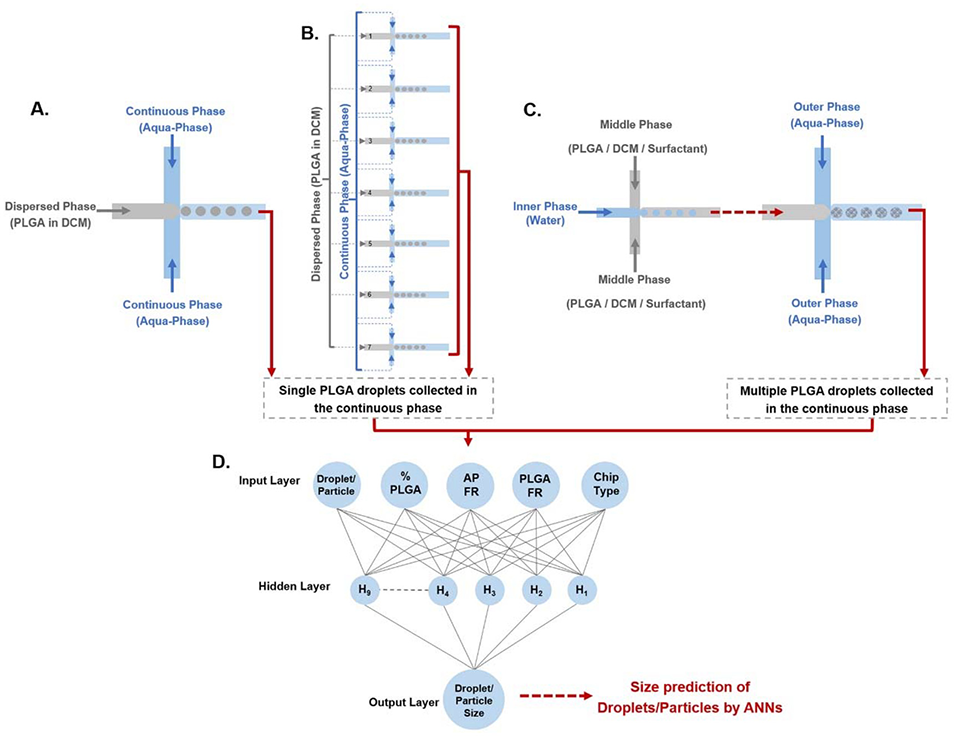 图8:单分散 PLGA 微滴制备与 AI 建模示意图。A-C 分别为单通道、七通道并行、双乳液微流控装置制备 PLGA 微滴的过程;D 为人工神经网络(ANN)模型结构,利用微滴数据训练模型以预测 PLGA 颗粒尺寸,提升合成可控性。