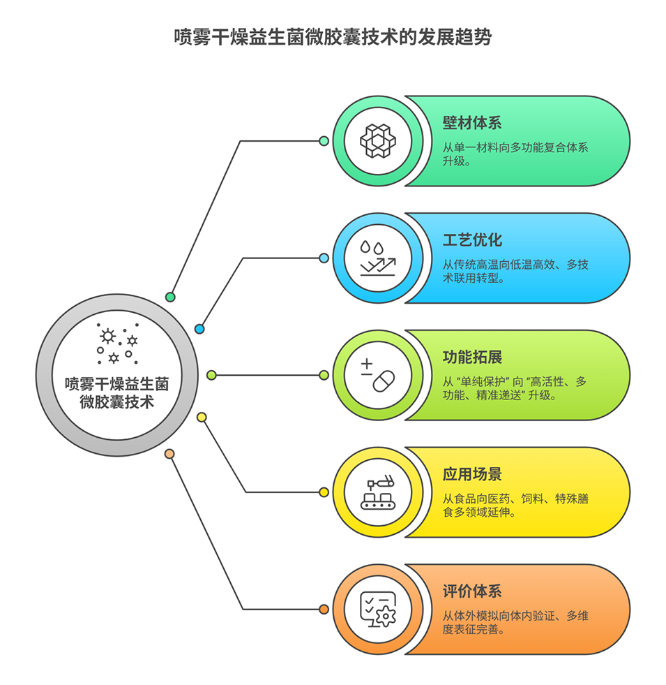 5、最后提及该技术在食品、饲料、医药领域的应用,并指出未来需突破低温技术产业化、平衡壁材保护与控释等方向,为喷雾干燥益生菌在多领域的应用与发展提供全面参考。