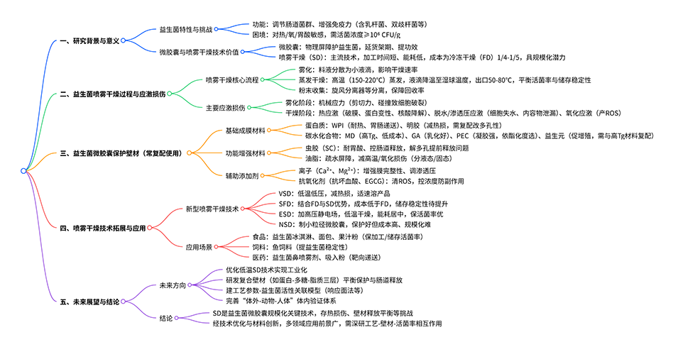 1、该综述围绕近10年喷雾干燥益生菌微胶囊研究展开,先明确益生菌对热、氧及消化环境敏感的特性与微胶囊技术的保护作用,指出喷雾干燥因成本低、能耗少、效率高成为主流制备技术。