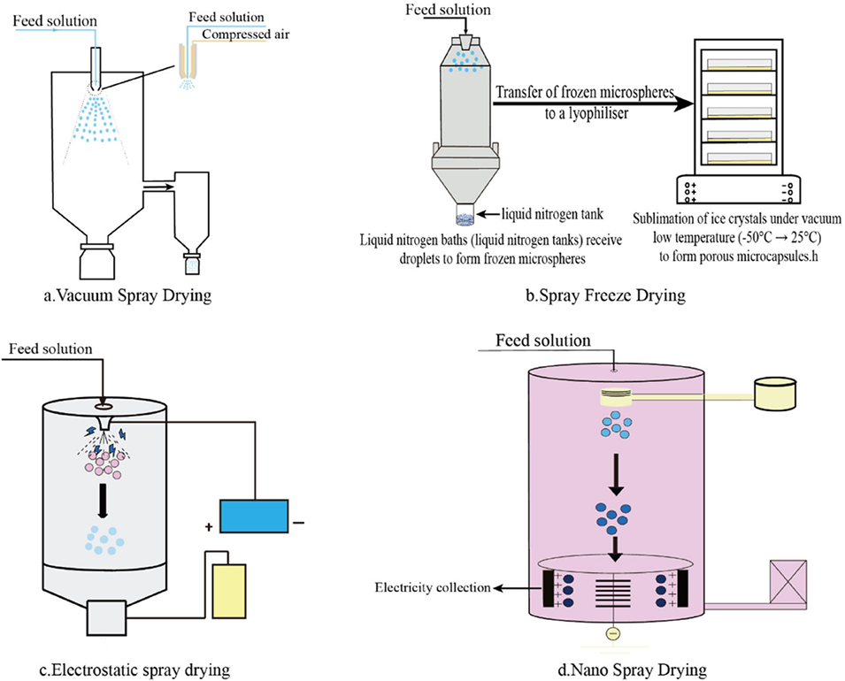 图4. 喷雾干燥技术拓展流程(a. 真空喷雾干燥;b. 喷雾冷冻干燥;c. 静电喷雾干燥;d. 纳米喷雾干燥)