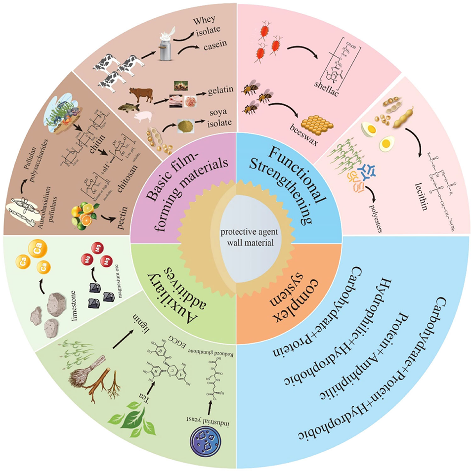 3、随后从基础成膜材料(蛋白质、碳水化合物等)、功能增强材料(虫胶、油脂)、辅助添加剂(离子、抗氧化剂)三类系统梳理保护壁材的特性与作用。