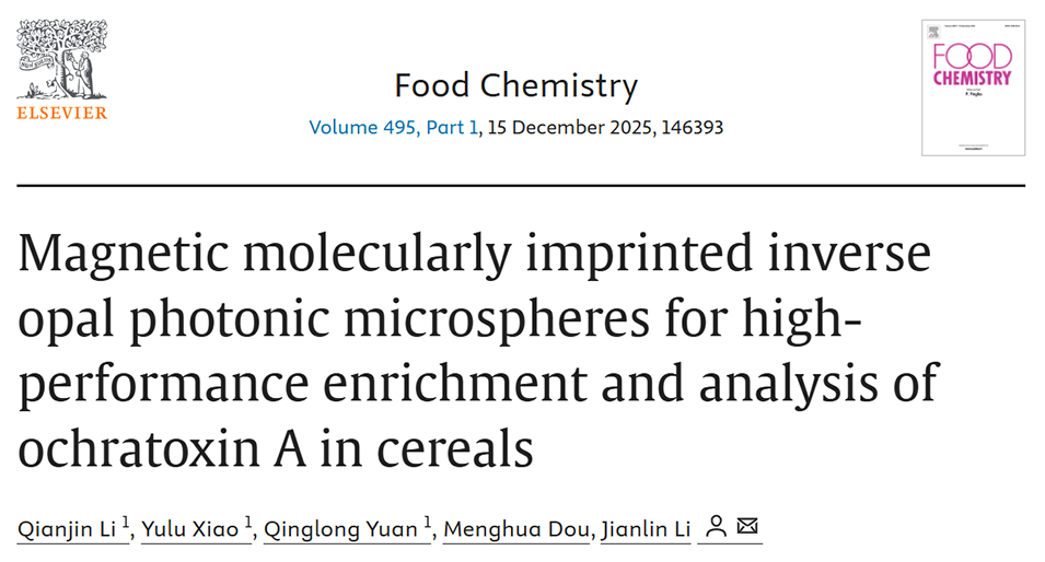 赭曲霉毒素A(OTA)是一种存在范围极广的霉菌毒素,可通过食物链威胁人体健康。因此,开发有效的OTA分析方法以防止受污染谷物进入食物链至关重要。近期,南京师范大学食品科学与制药工程学院李建林教授团队开发了一种基于微流控自组装策略的分子印迹磁性反蛋白石光子晶体微球新材料。将其作为样品前处理材料与高效液相色谱(HPLC)联用,建立了谷物中OTA的高选择性富集与检测方法。该方法检测限低至0.48 ng/mL,加标回收率达80%-104%,为受污染谷物的筛查提供了高效解决方案。相关研究以“Magnetic molecularly imprinted inverse opal photonic microspheres for high-performance enrichment and analysis of ochratoxin A in cereals”为题目,发表于期刊《Food Chemistry》。