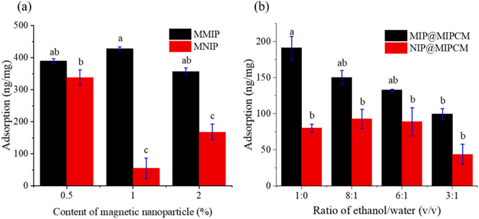 图2:(a)预聚合体系中磁性纳米粒子含量不同时,制备的磁性分子印迹纳米粒子(MMIPs)对模板分子的吸附量(吸附测试溶剂:乙醇/水体积比=3:1;MMIPs浓度:2mg/mL;模板分子浓度:20μg/mL);(b)不同吸附溶剂中,MIP@MMIPs对OTA的吸附量(微球浓度:2mg/mL;OTA浓度:1000ng/mL)。不同小写字母表示差异具有统计学意义(P<0.05)