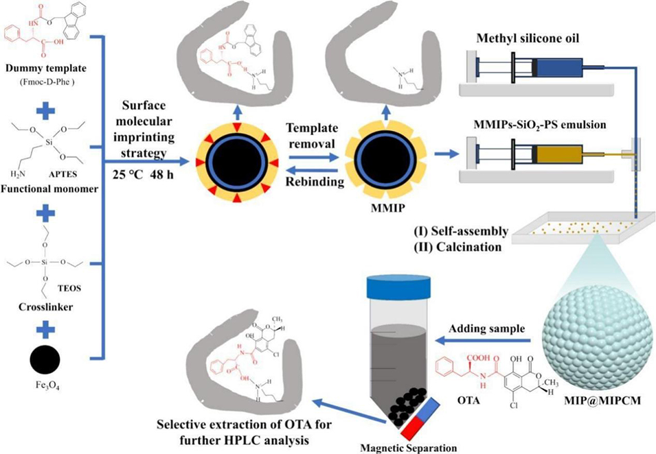 图1:分子印迹聚合物包覆磁性反蛋白石光子晶体微球(MIP@MIPCMs)的制备流程及用于实际样品中OTA选择性提取的示意图