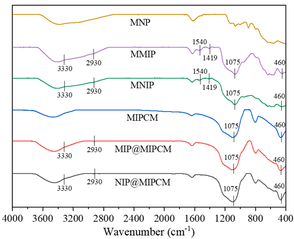 图3:磁性纳米粒子(MNP)、磁性分子印迹纳米粒子(MMIP)、非印迹磁性纳米粒子(MNIP)、磁性反蛋白石光子晶体微球(MIPCM)、分子印迹聚合物包覆磁性反蛋白石光子晶体微球(MIP@MIPCM)及非印迹聚合物包覆磁性反蛋白石光子晶体微球(NIP@MIPCM)的红外光谱图