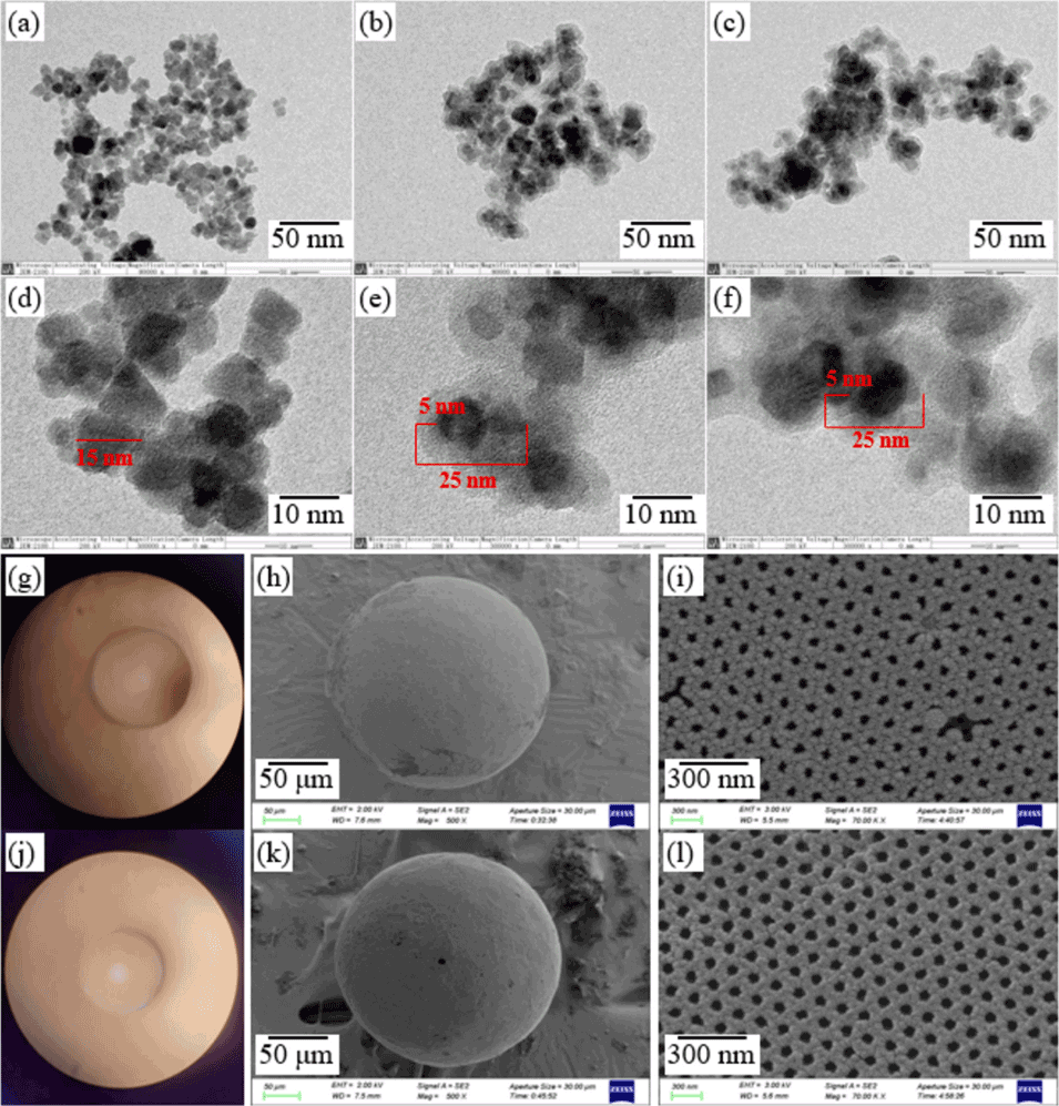 图4:磁性纳米粒子(a, d)、MMIPs(b, e)和MNIPs(c, f)的TEM图像;MIP@MIPCM(g)和NIP@MIPCM(j)的金相显微镜图像;MIP@MIPCM(h, i)和NIP@MIPCM(k, l)的SEM图像
