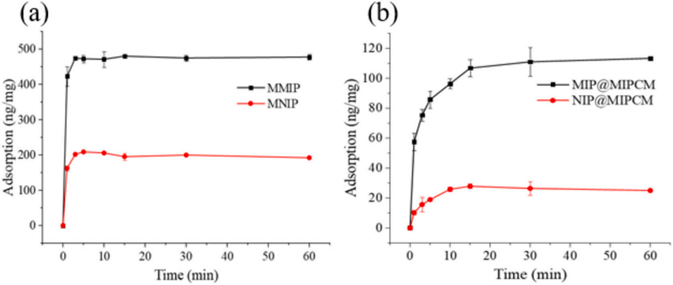 图6:MMIP(a)和MIP@MIPCM(b)及其对应对照聚合物(MNIP、NIP@MIPCM)的动态吸附行为(聚合物浓度:2mg/mL;OTA浓度:1000ng/mL;溶剂:乙醇)
