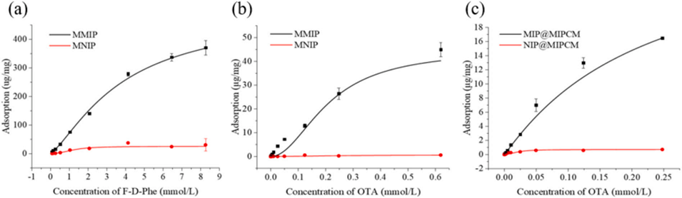 图5:MMIP与MNIP对F-D-Phe(a)和OTA(b)的静态吸附曲线,以及MIP@MIPCM与NIP@MIPCM对OTA的静态吸附曲线(c)(吸附溶剂:乙醇;材料浓度:2mg/mL)